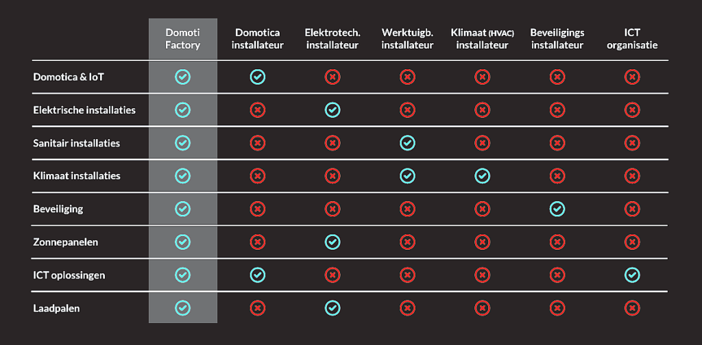 Bij Full Service installateur zijn alle disciplines van het installatiewerk bij elkaar gebracht zodat jij maar één contactpunt nodig hebt voor de volledige installatie. Hierdoor lopen er niet onnodig veel verschillende bedrijven rond op de bouwplaats en worden eventuele problemen, vaak door slechte communicatie, eenvoudig voorkomen.